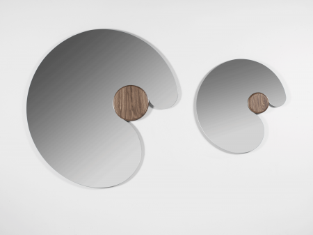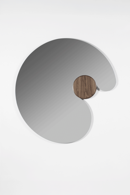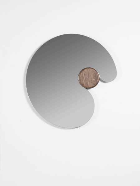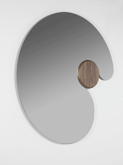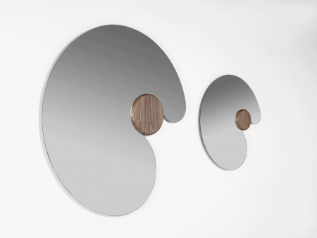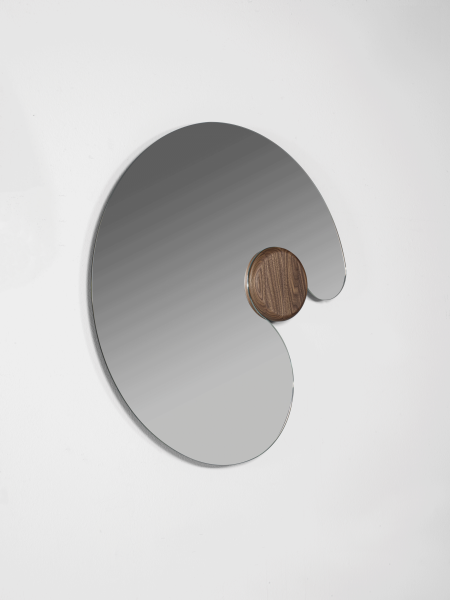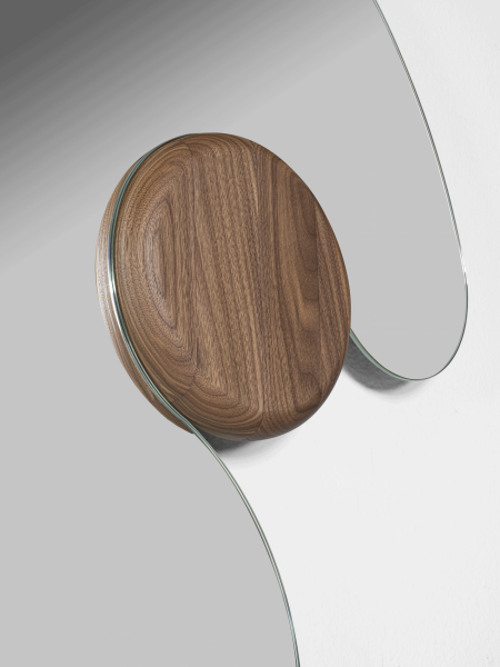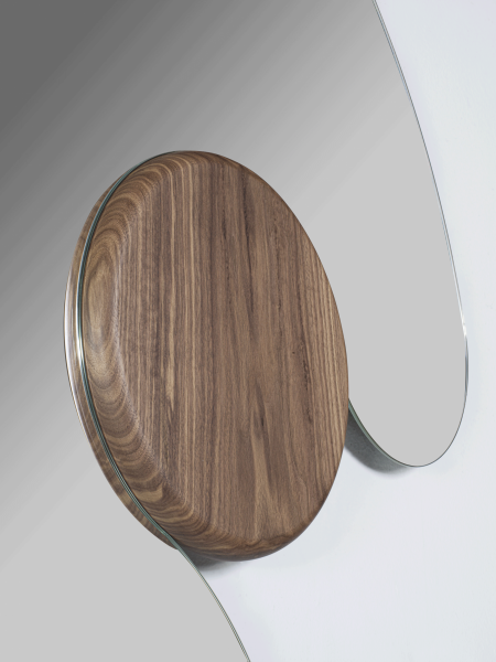 Specchio realizzato in varie dimensioni e caratterizzato da una forma tondeggiante e avvolgente che abbraccia un volume di legno massello.