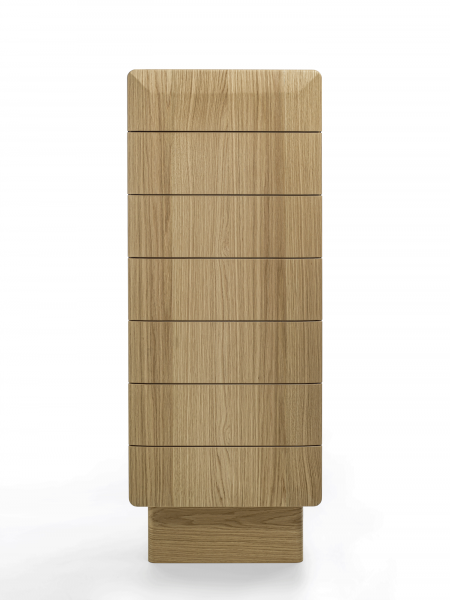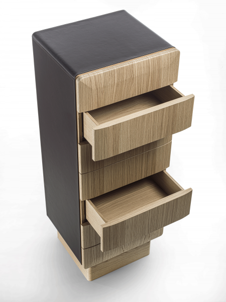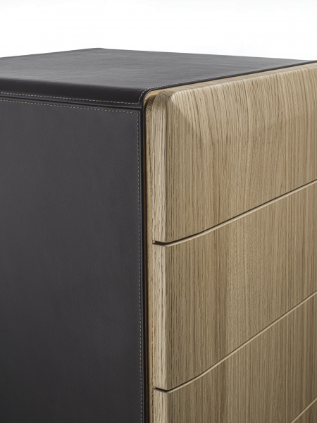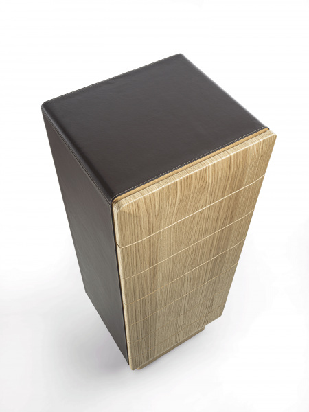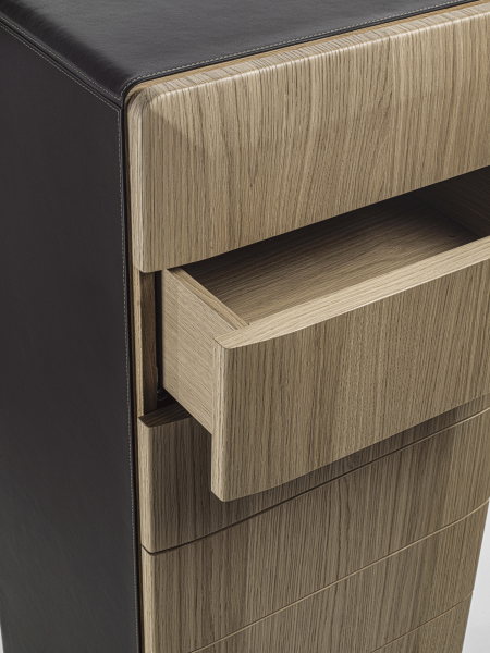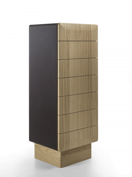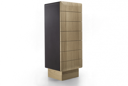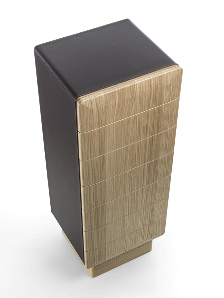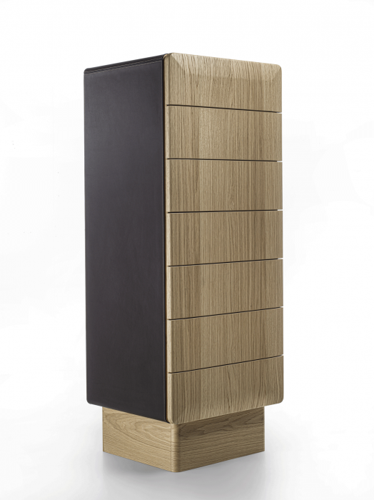 Mobile contenitore con struttura in legno, composto da sette cassetti e con basamento disponibile in diverse finiture: ottone bronzato, legno, o metallo laccato nero. La struttura può avere finitura in legno o rivestita in pelle ed anche i cassetti possono essere in legno, rivestiti in pelle o laccati.